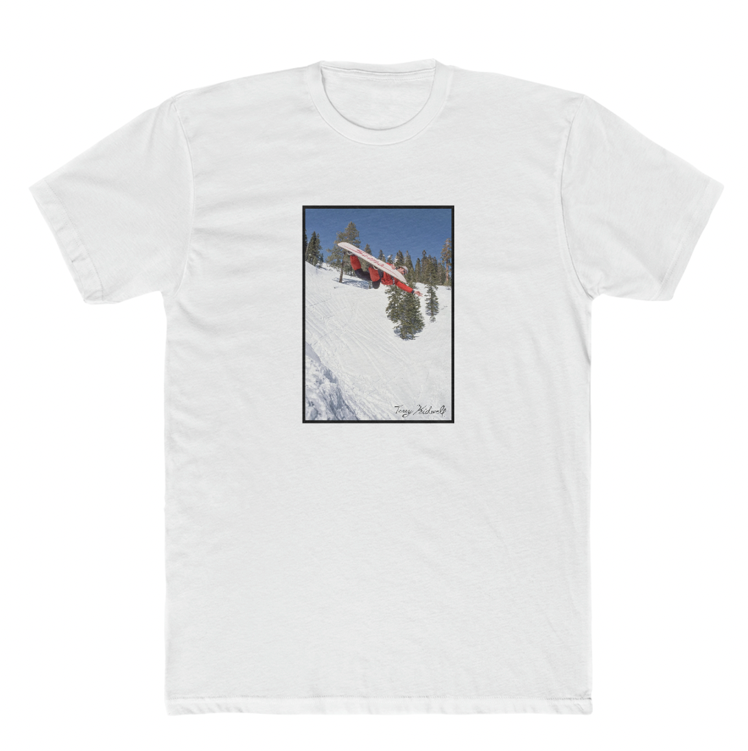 この T シャツは、フリースタイル世界チャンピオンを 4 回獲得したテリー キッドウェルをフィーチャーしています。この写真はバド・フォーセットによってドナー・ハーフパイプ(タホ)で撮影されたもので、1980年代の最も象徴的なスノーボード写真の1つです。